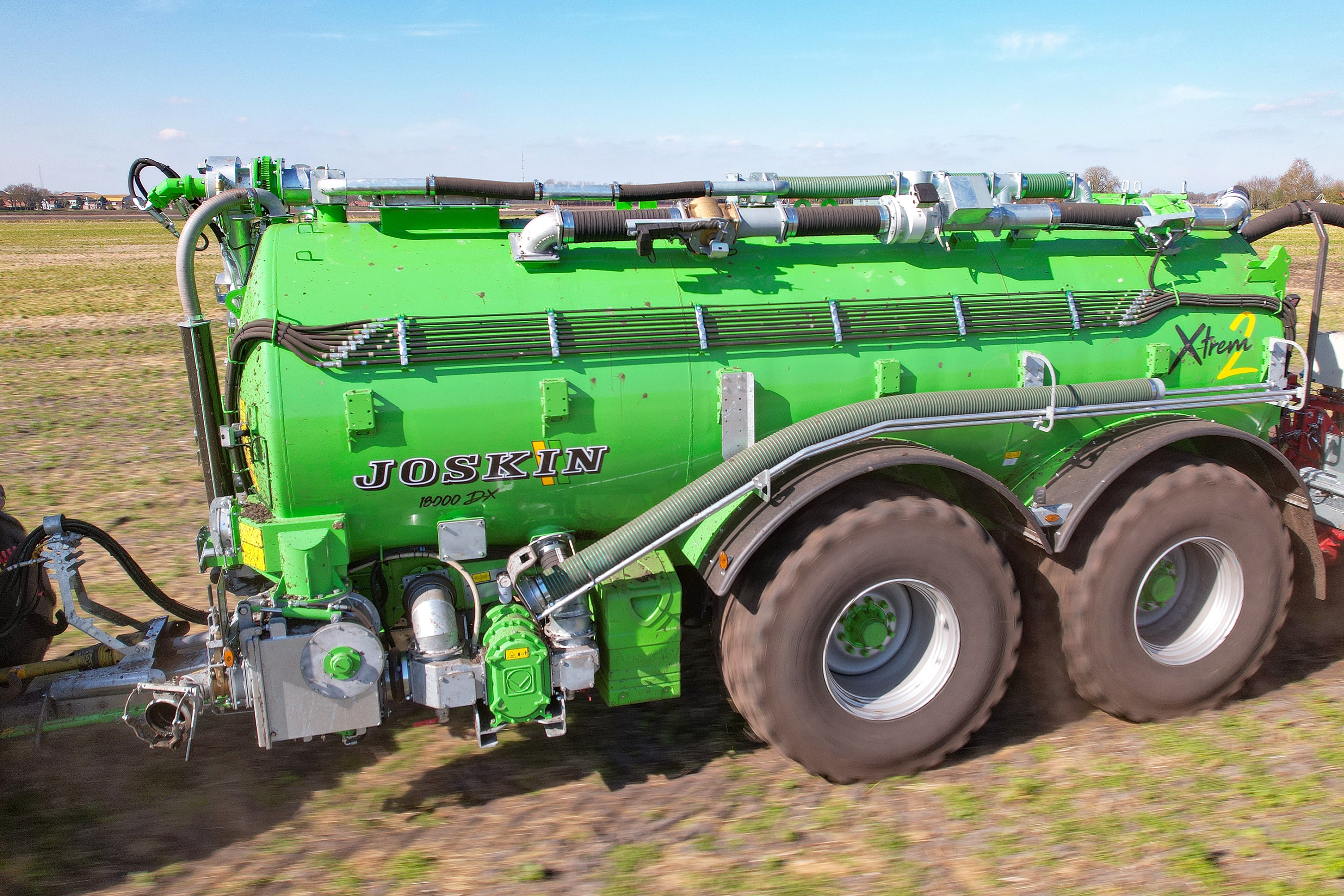 Das X-TREM2 ist ein wahres Konzentrat des Know-hows von JOSKIN. Dank seines raffiniert verengten Fahrgestells (600 mm) gelingt es diesem Fass, einen Tank mit großem Fassungsvermögen mit Rädern von großem Durchmesser (max. Ø 1.986 mm) zu kombinieren, ohne dass die Gesamtbreite 3 Meter überschreitet oder die Fahrleistungen beeinträchtigt werden. Aufgrund seiner einzigartigen Eigenschaften verfügt der X-TREM2 Güllewagen über eine perfekte Gewichtsverteilung und eine ausgezeichnete Bodenführung (Hydro-Pendul-Fahrwerk) und erzeugt somit nur eine sehr geringe Bodenverdichtung. Der X-TREM2 Güllewagen ist ebenfalls sehr robust gebaut und dürfte wohl jeden landwirtschaftlichen Lohnunternehmer zufrieden stellen, der eine Maschine von kurzer Gesamtlänge sucht, das mit allen möglichen Gülleinjektoren oder Ausbringbalken arbeiten kann.