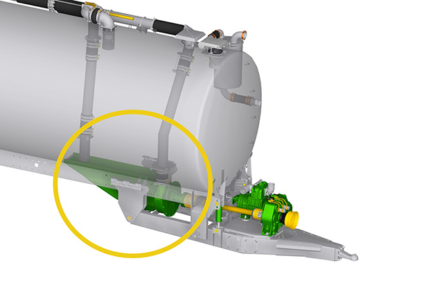 The VACU-STORM system combines the advantages of a vacuum pump on the suction side and a STORM centrifugal pump on the discharge side. It is an ideal solution for users who are looking for an absolute flexibility. This process guarantees a high performance. The pumps are P.T.O. driven via a reinforced one-piece gearbox. The Jurop PN 130 - 13,000 l/min is integrated in the drawbar and is used for suction. The PN 155 and PNR 155 (+/- 15,200 l/min) are available as options. The vacuum system has the great advantage of being well adapted to all pumping situations (underground or off-ground pits, funnel, etc.). The STORM centrifugal pump (10,000 l/min) is designed to feed the rear implement. It allows spreading over large widths and with a high and constant flow rate. Ideally placed under the tank with the stone trap, it ensures a smooth and even feeding of the slurry, while reducing maintenance to a minimum. This design provides a safe and convenient access.