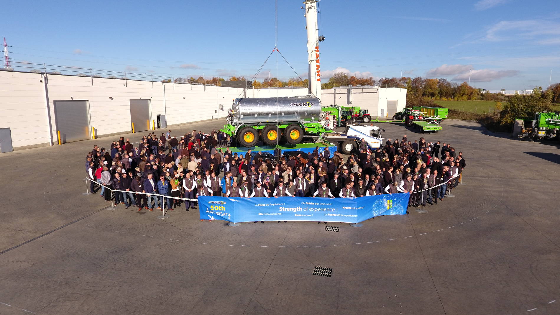 During the preparations, 120 staff members made a first trial with a 4,800 kg Modulo2 tanker. This challenge was a first success. The aim was therefore to do better. For D-day, a Euroliner of almost 12 tons was chosen. Even if this was a significant challenge, 330 particularly motivated dealers immediately offered their service to take it up. After some safety rules, all observed the Belgian motto, dear to the group, “Unity makes strength”, and started to pull as a single man. Immediately and under a particularly blue sky making the work of many journalists easier in order to seize the moment, the result became apparent: looking weightless, the Euroliner took off in one leap to then hang one meter above the floor under the proud look of the participants and organizers. The new record holders then hurried to pose for posterity with a message symbolizing their achievement: “Strength of experience”, before being encircled by a parade of tractors forming the number 50.