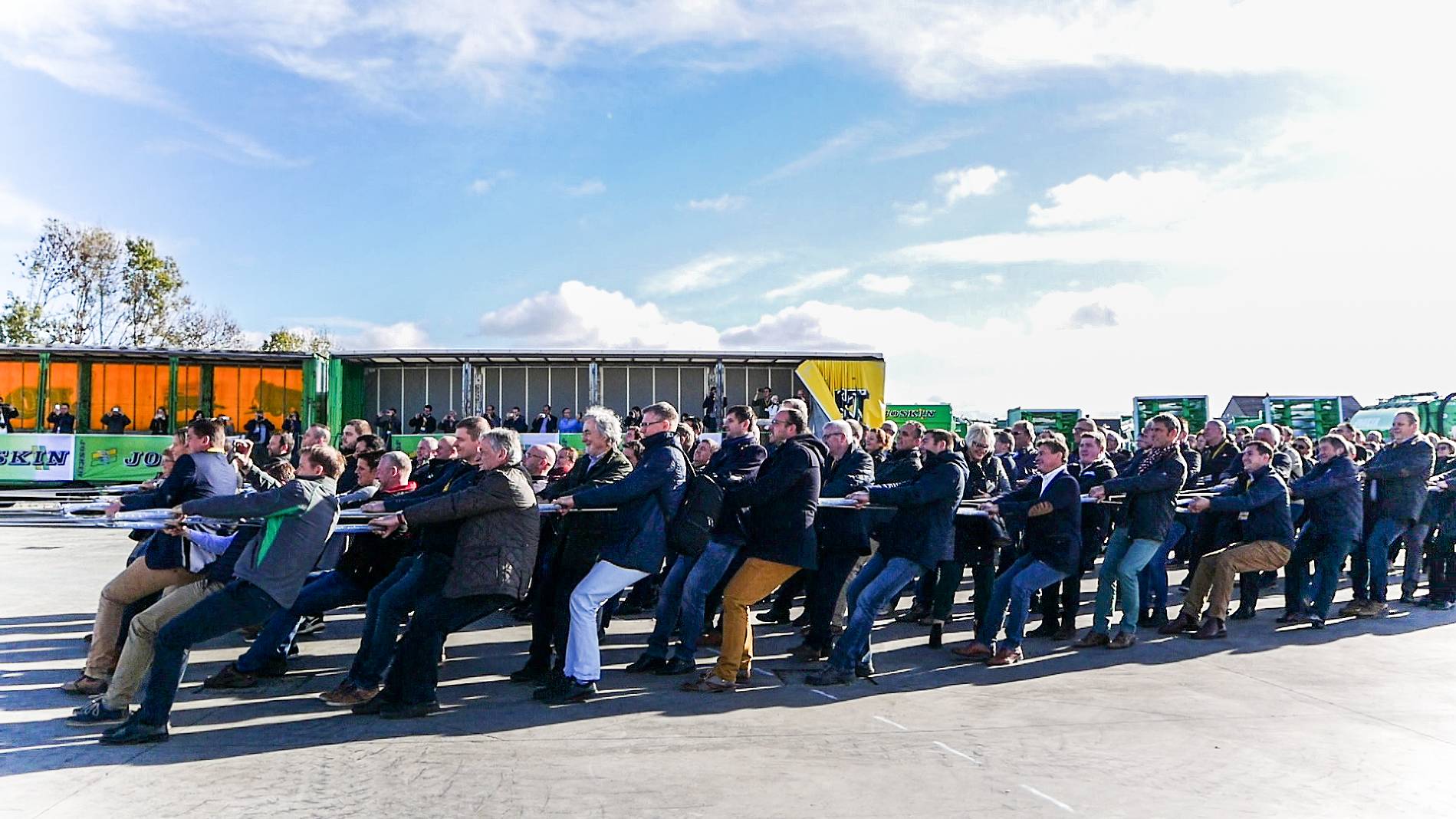 Next to this attractive and apparently well appreciated programme, the company, true to its reputation, had planned something rather astonishing: a challenge. It was rather original, even crazy, since the aim was to lift a triple-axle Euroliner slurry tanker of almost 12 tons with muscle power only! It was however not without reason. An entire symbolism was hidden behind this unexpected idea. Celebrating its first half century of existence, JOSKIN considers indeed that the success of its brand lies in the strength of its experience but also in the strength of its distribution network and of staff members who have been for all this time particularly attached to their company. The aim was to prove it in a symbolic way with a challenge that many thought was impossible.