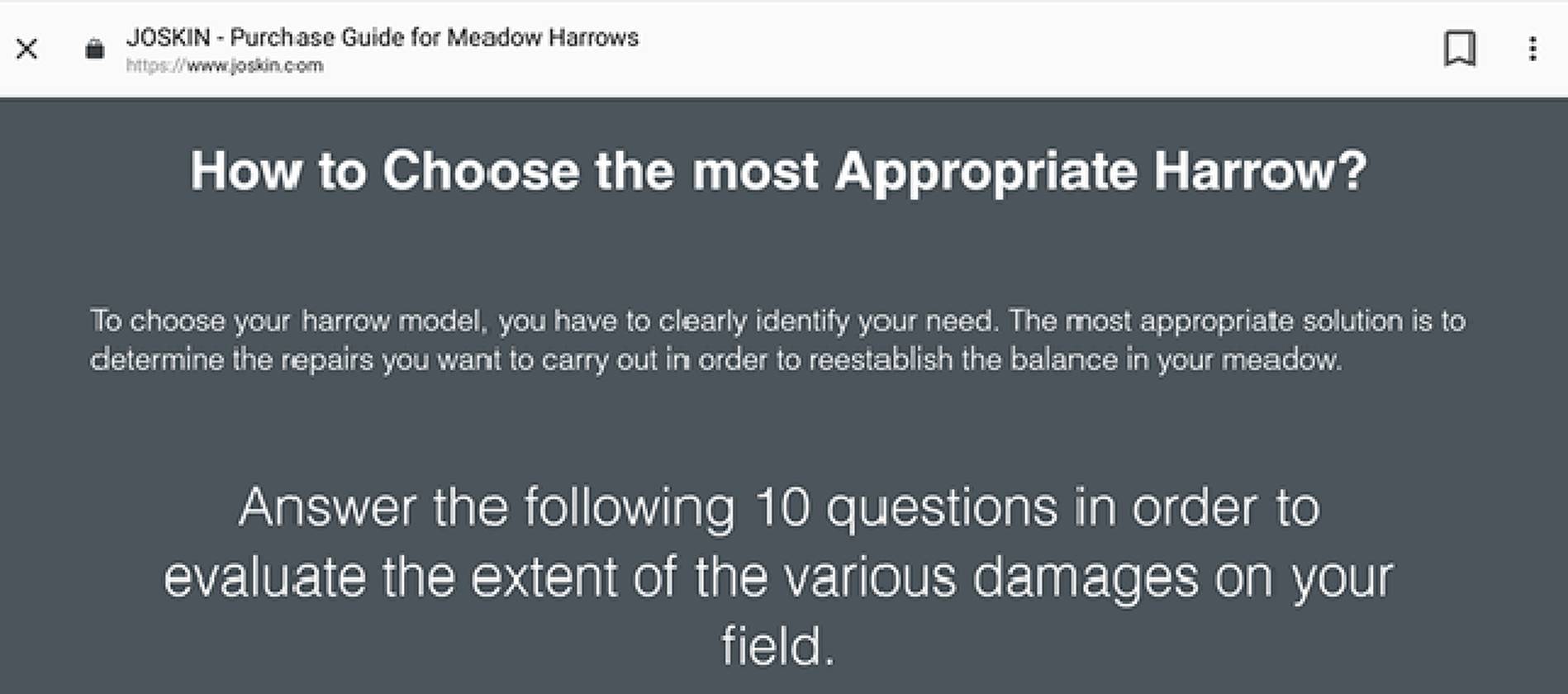 Thanks to guide’s organised and didactic layout, it allows the user to easily compare the conditions on his farm with the specifications of the various products of the Joskin range. The user then has to answer a few multiple-choice questions to be sure he chooses the right equipment to suit his needs. Depending on the different answers, the guide will present the matched product.s and refer to the product page in order to get more information to potentially confirm his choice.