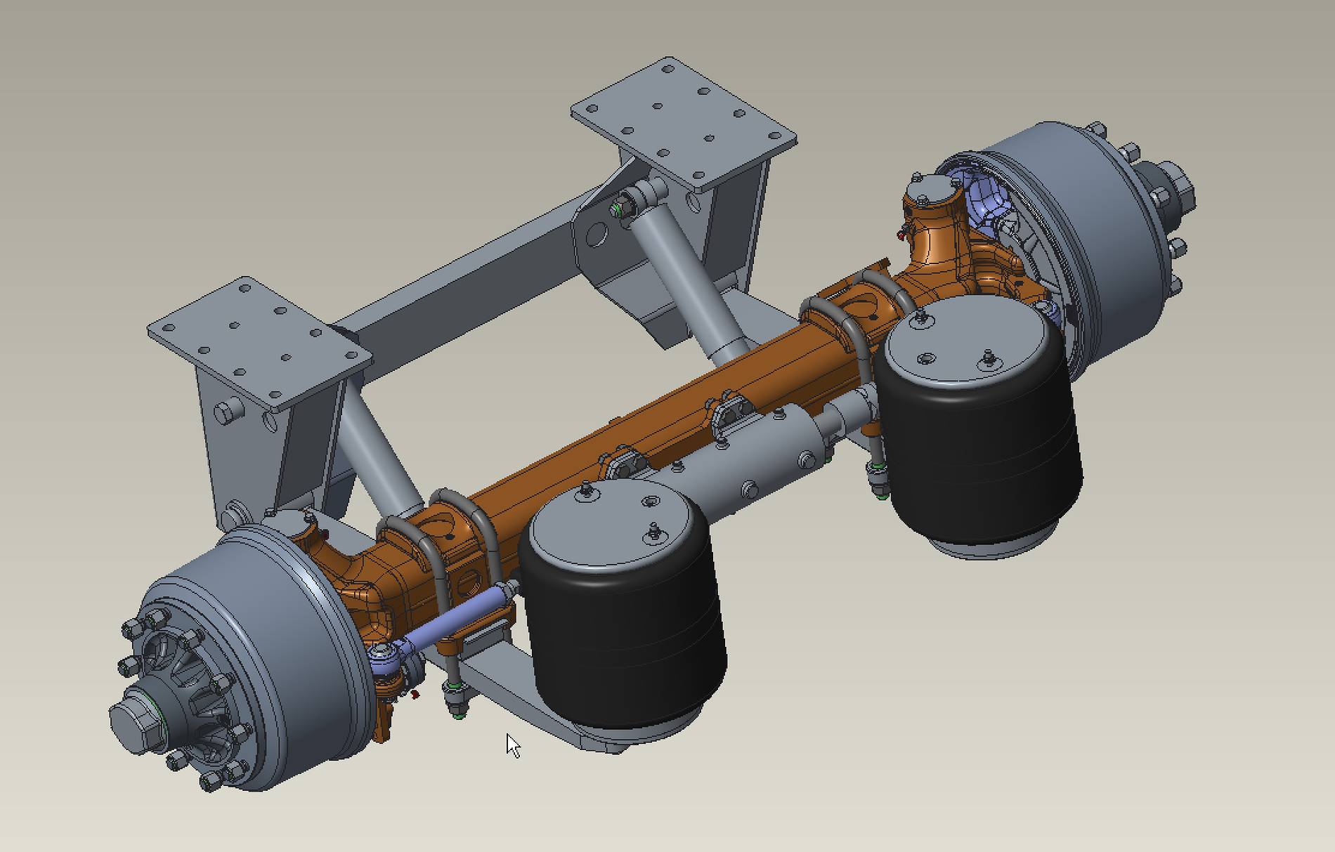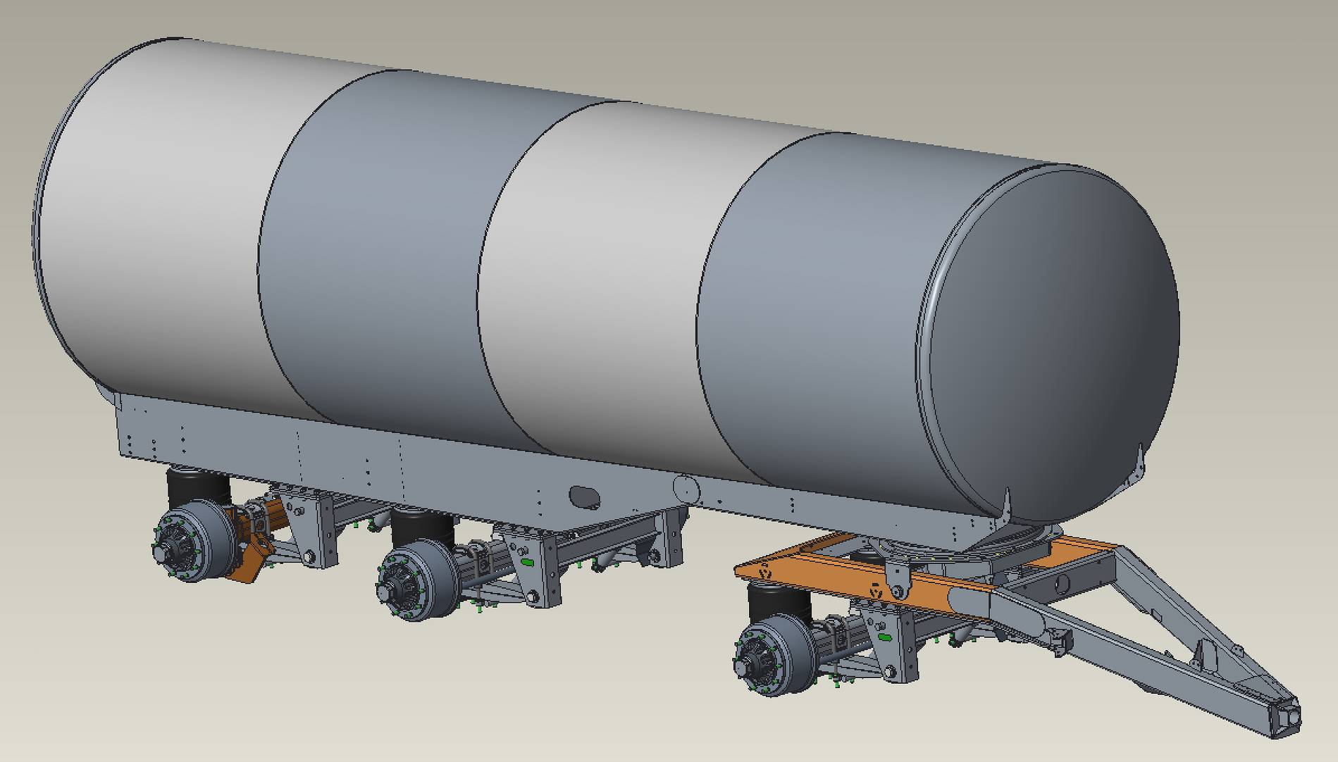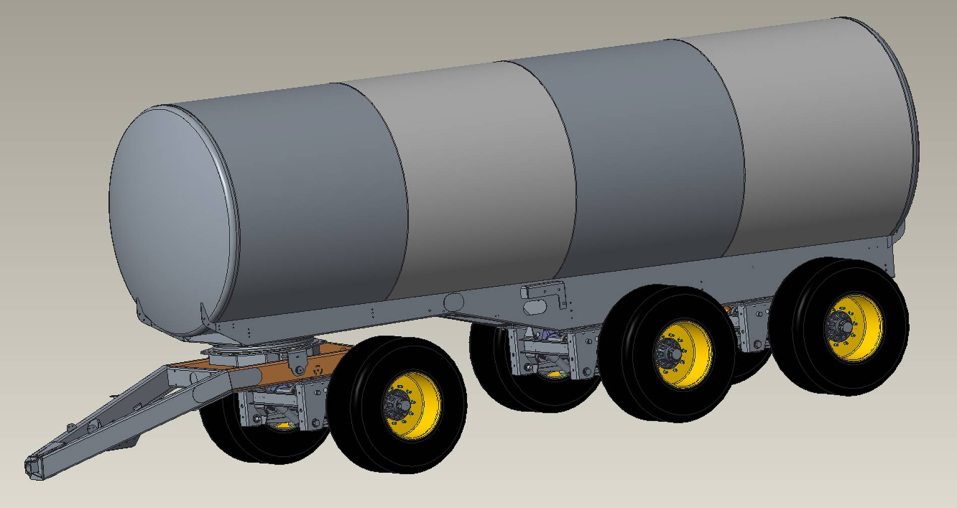 Next to the first axle on turntable, this model is also standard fitted with a fixed axle and a fast-type rear free steering axle (with DA hydraulic locking system), which allows, e.g. in Germany, to register the vehicle in the 60-km/h category! They can be fitted with road tyres (400R22.5), but also with wider 560/60R22.5 tyres with many different profiles in order to adapt the tanker to any kind of terrains and conditions.