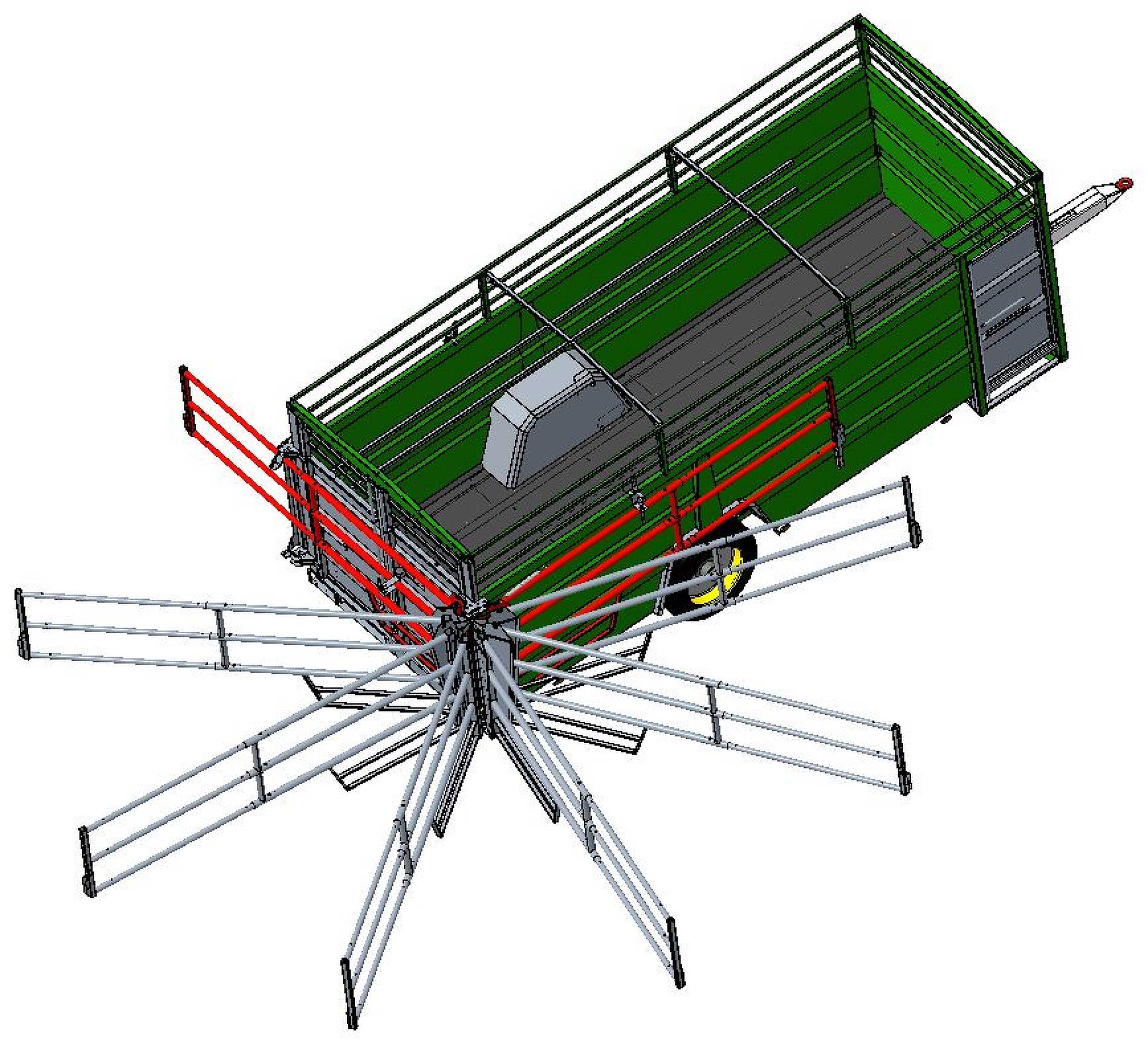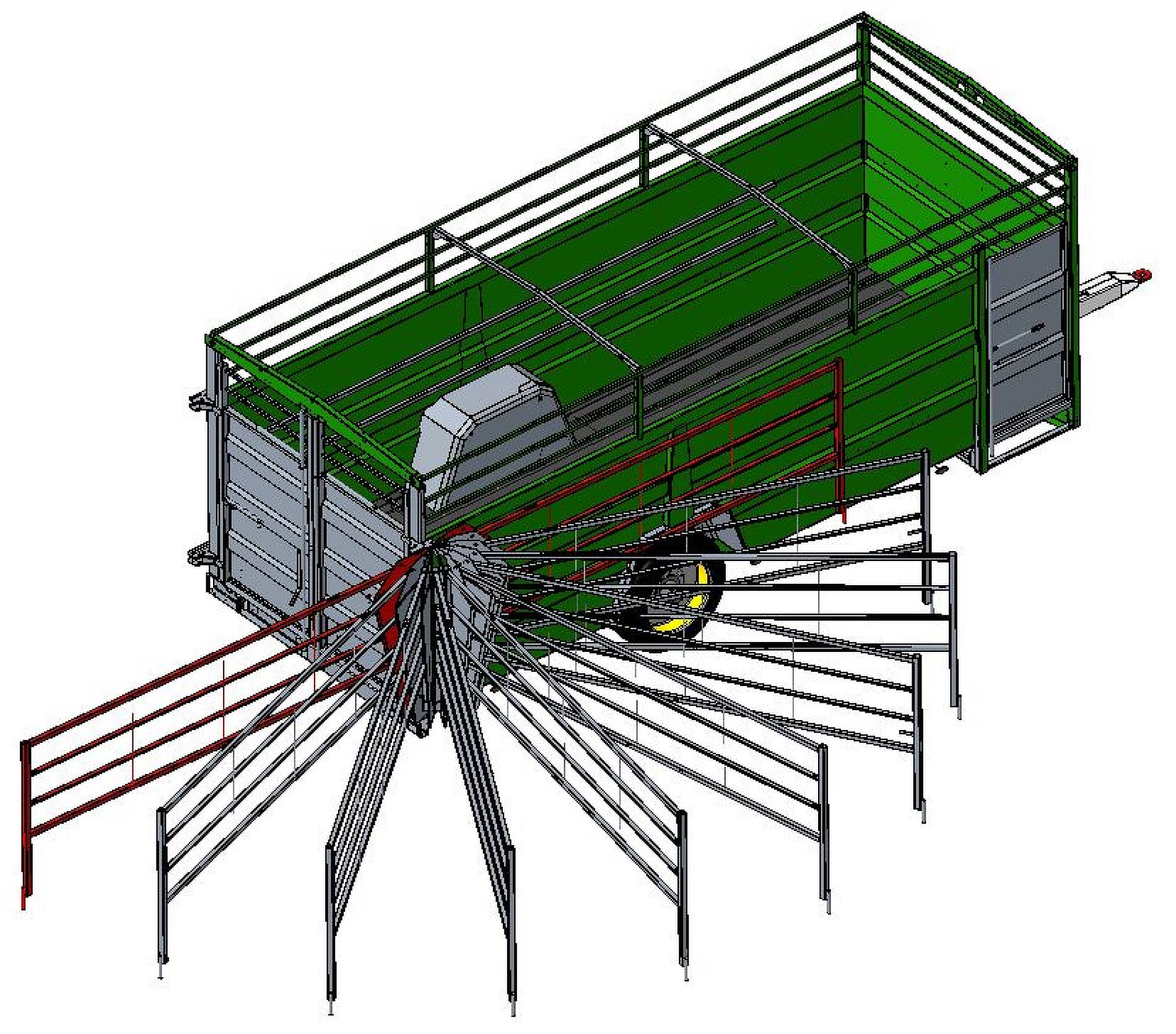The “articulated fences” are a simple and basic solution based on a solid structure made up of square profiles. Fixed on hinges at the rear end of the livestock trailer, these open by pivoting up to 190 º. They are available in lengths of 3.50, and 4.50 m.