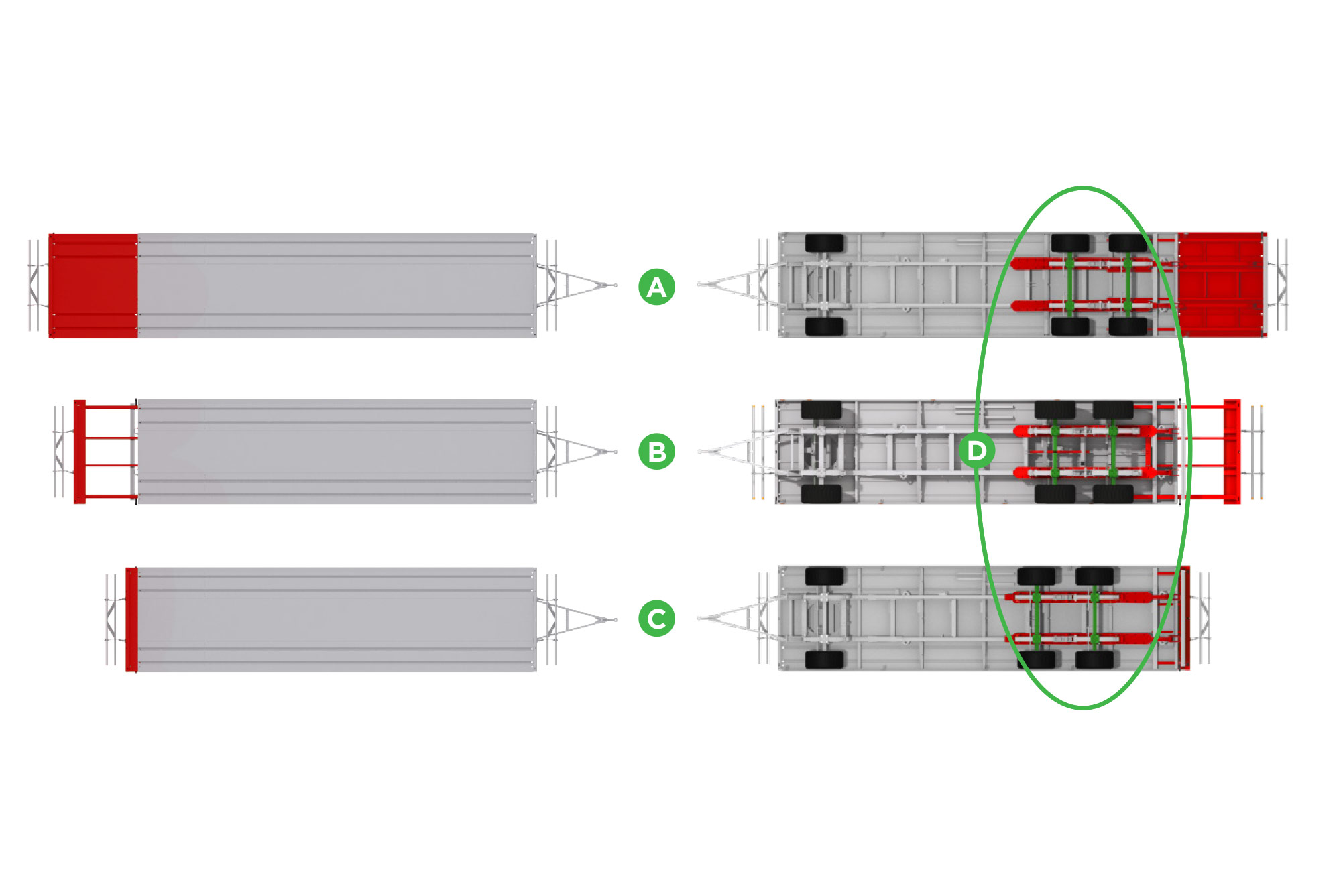 Con soportes delanteros y traseros (sólo disponibles en los modelos de 8 m y 10 m, incluyendo WAGO-Loader con rampas manuales o rampa telescópica).