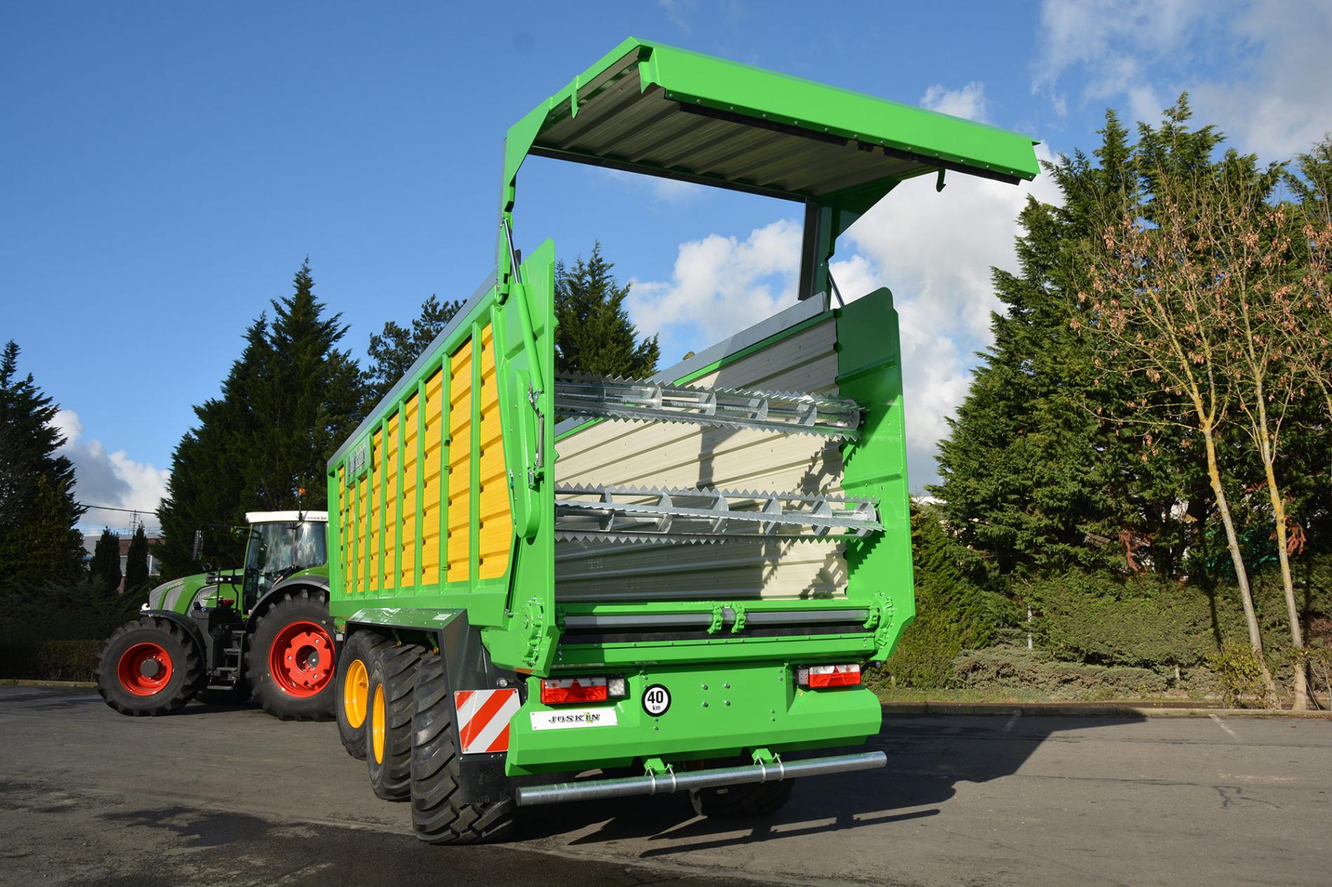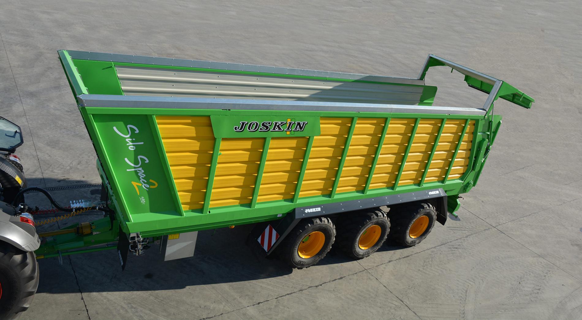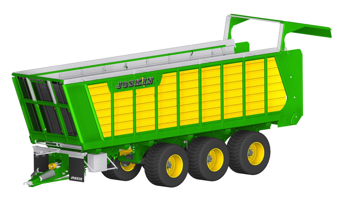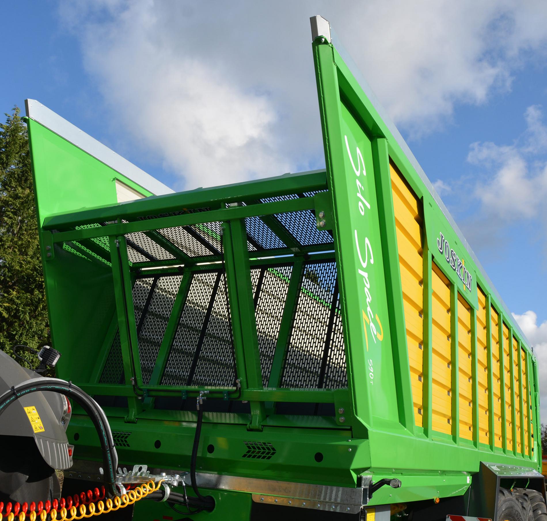 Инженеры JOSKIN полностью изменили дизайн передней стенки нового прицепа Silo-SPACE 2. Теперь она установлена под углом 22° относительно трактора, а не 10°, как это было раньше. Благодаря этому, удалось увеличить объем кузова. Стенка складывается вдвое в направлении назад при выгрузке. Она на 160 мм выше основного кузова.